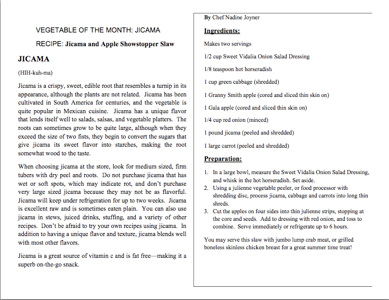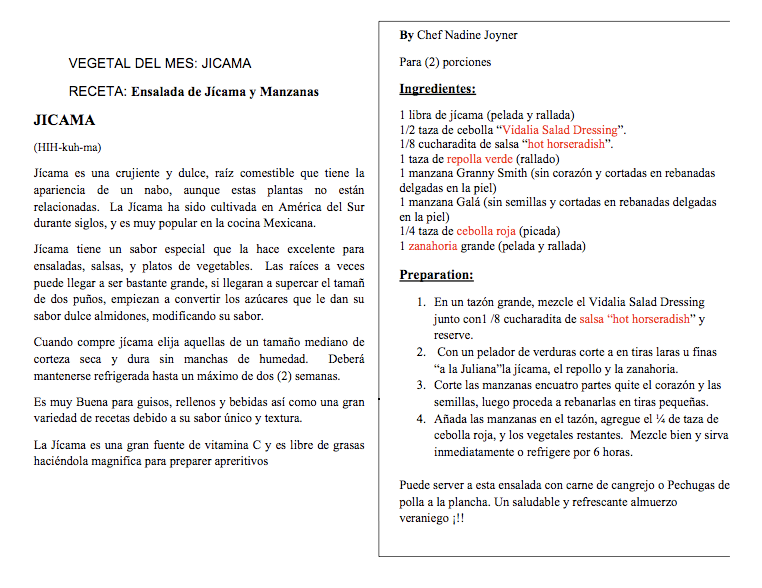 Here is a recipe, in both English and Spanish, for my Jicama and Apple Showstopper Slaw. Give it a try. Healthy eating changes lives, and I am on the road every day spreading that message – because it changed mine.